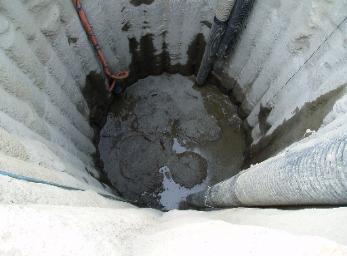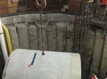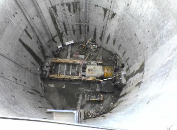 "Secant pile Shaft" 80 feet deep to receive the tunnel boring machine after it tunnels under the American River. Two of these shafts were required, one for each 600 LF long tunnel. The shaft inside diameter is approx. 22 feet. |