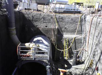 Tunnel Boring Machine (EPBM) for 13-foot diameter tunnel under an environmental wetland in Sacramento. Excavation shoring is by "soil nailing" and grouted tie-backs 30' long. Perry provided Resident Engineering for SRCSD. |